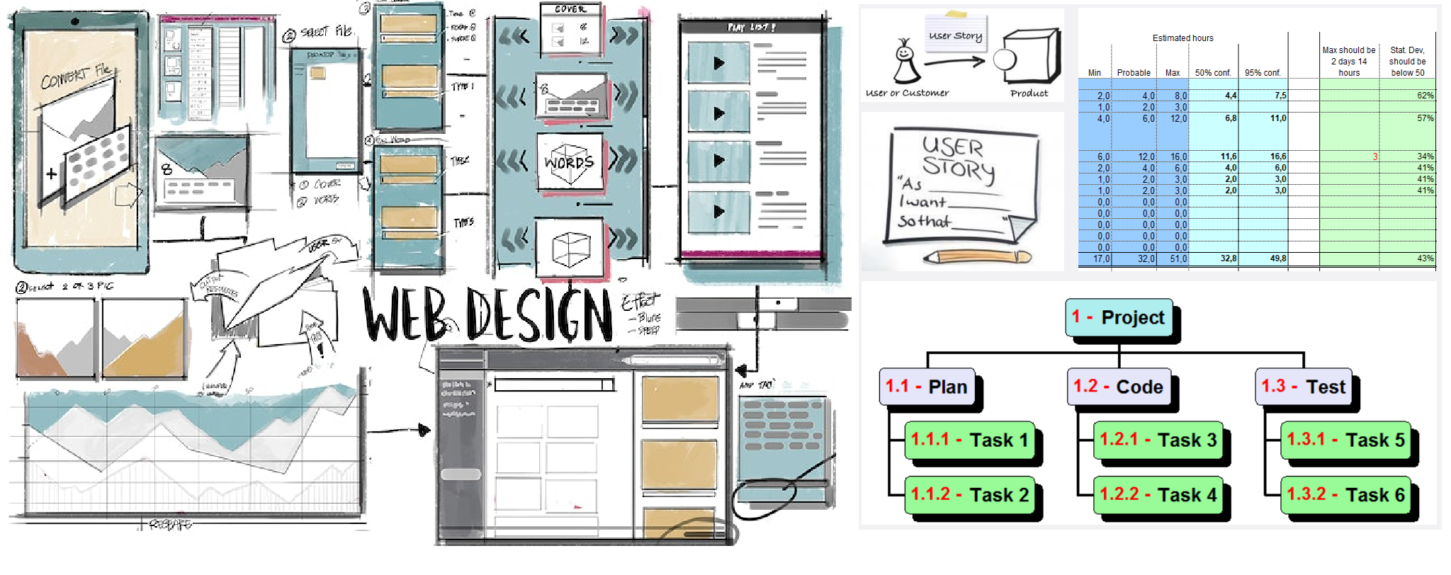 • estimation of the necessary time and material resources. We use all our experience to break down the requirements into identified pieces of work (ie. Build user interface x and y). This is called a Work Break Down structure (WBS);